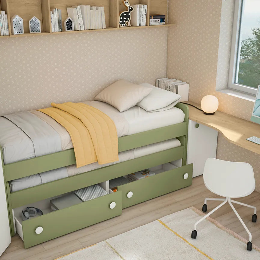 L'armadio a cabina Effe, con il suo design essenziale e sofisticato, è dotato di un elegante pomello Seed e di un terminale libreria Pill, che aggiunge un tocco di originalità e permette di sfruttare al meglio lo spazio a disposizione. La zona notte è dominata dal letto scorrevole in finitura Oliva, un modello pratico e funzionale con due reti e ampi cassettoni per il contenimento. Perfetto per chi cerca una soluzione che combini estetica e praticità.