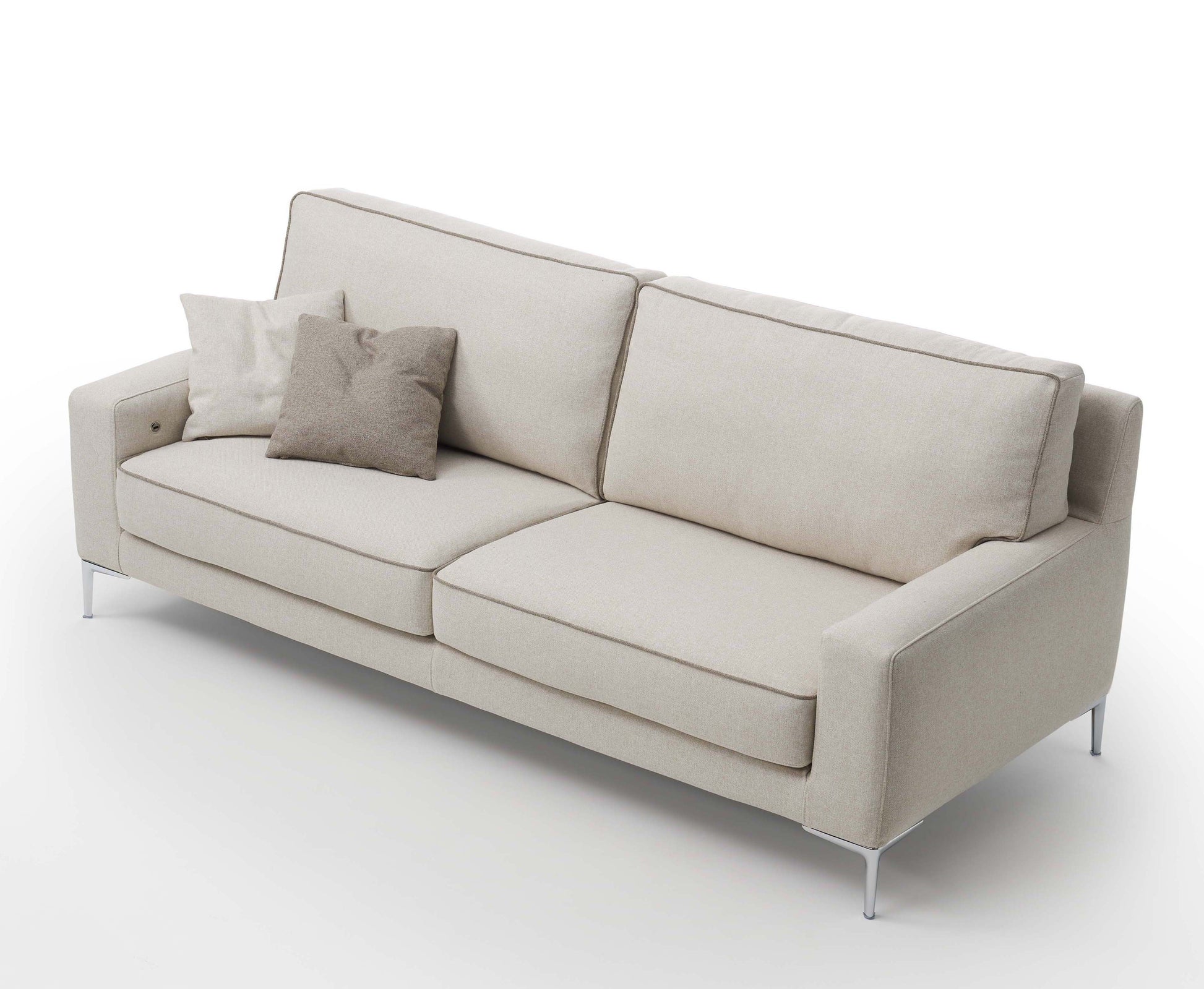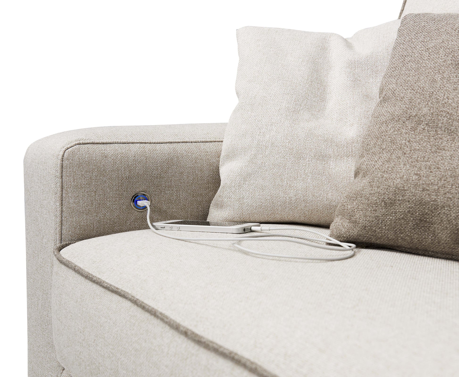 Il modello Olga offre di serie una presa USB posizionata sul fianco interno del bracciolo sinistro e bordino sui cuscini di seduta e di schienale in tinta.