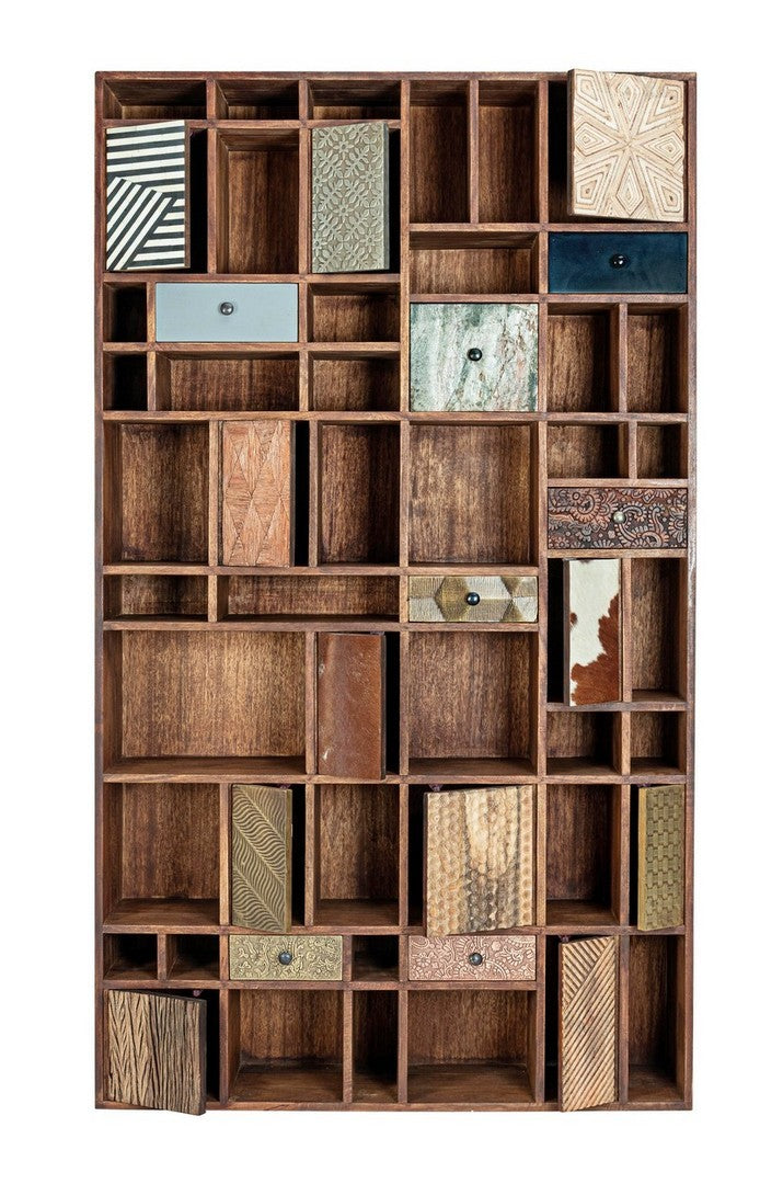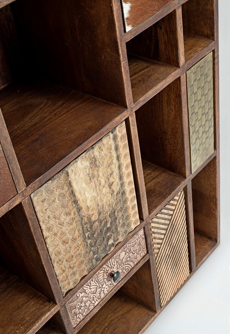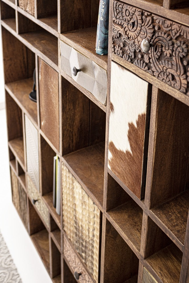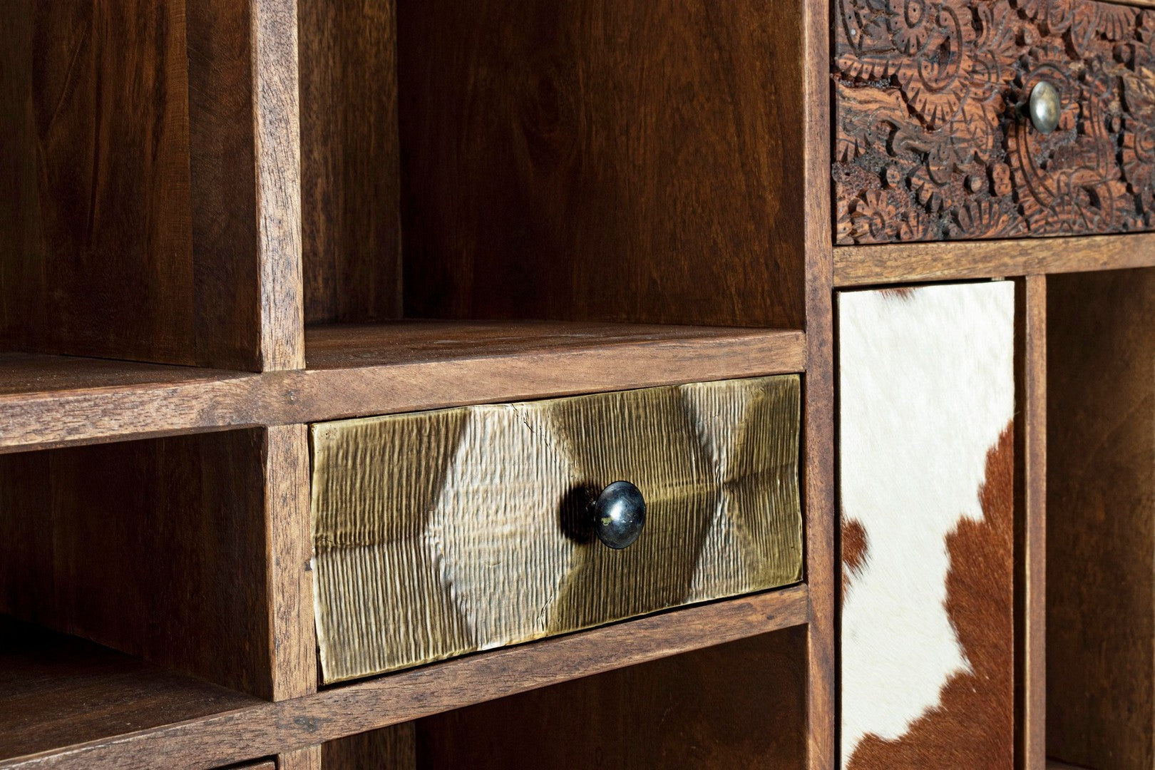 STRUTTURA IN LEGNO DI MANGO, SCHIENALE IN MDF. FRONTALE ANTE E CASSETTI IN LEGNO RICICLATO MANGO ED ACACIA CON APPLICAZIONI IN METALLO E PELLE. STRUTTURA CASSETTI IN MANGO ED ACACIA. FINITURA CON VERNICE A BASE D'ACQUA. MANIGLIE IN ACCIAIO.