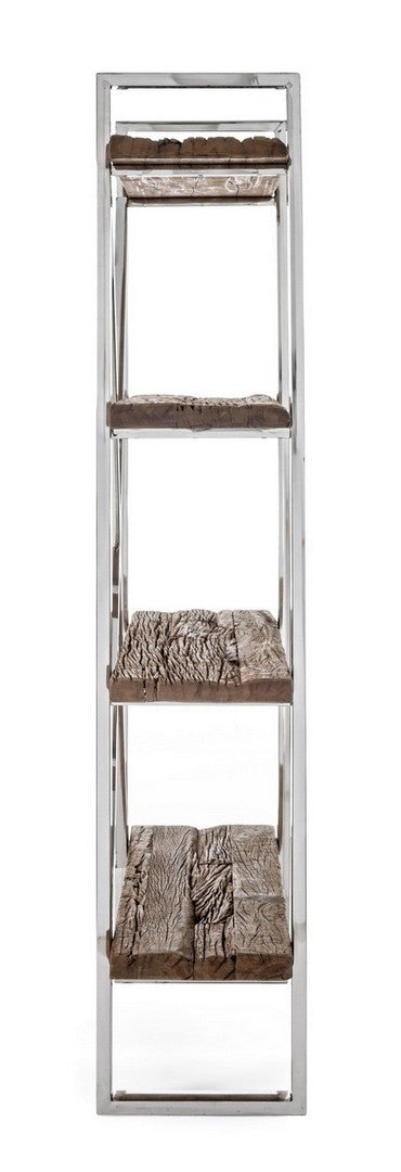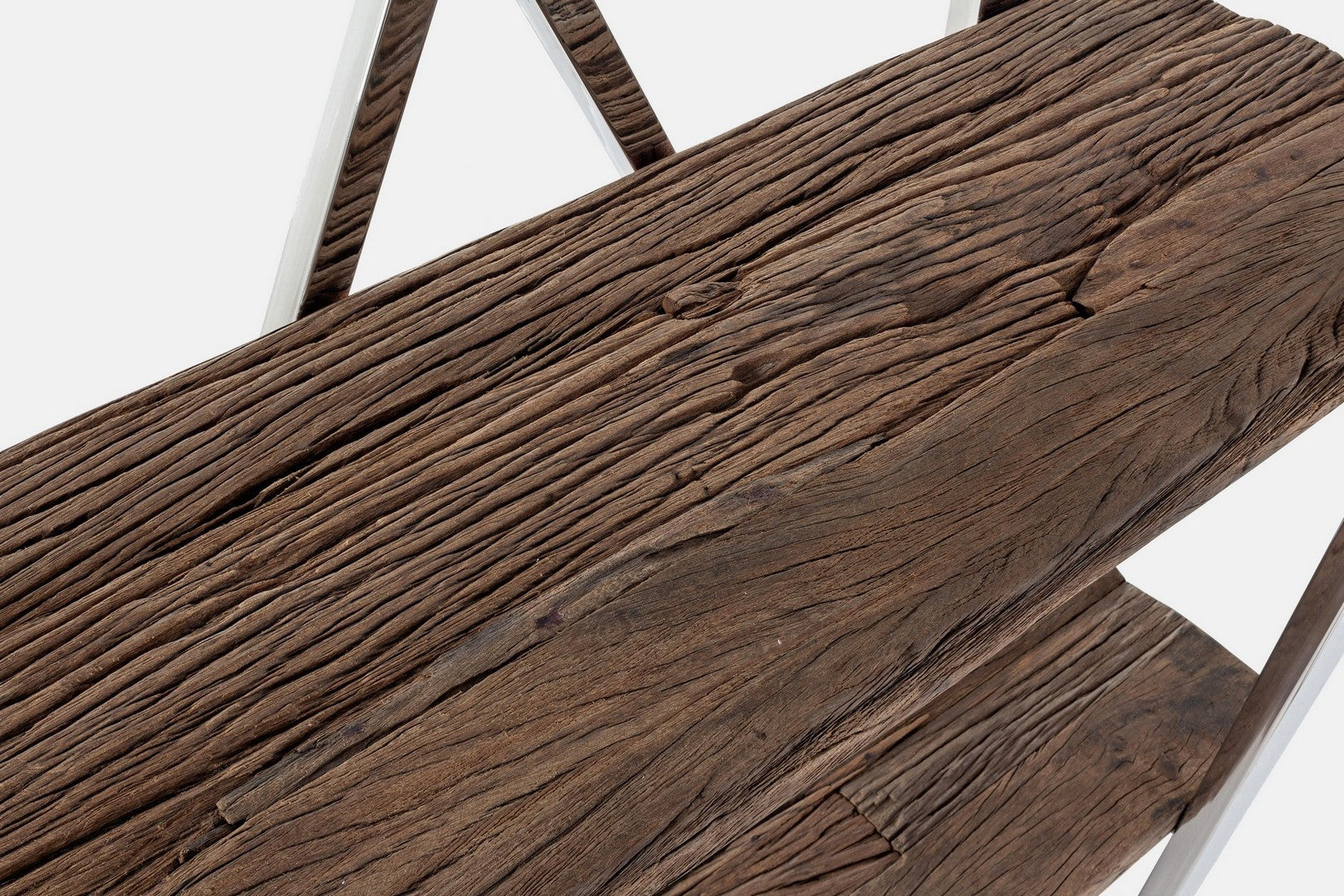 STRUTTURA IN ACCIAIO INOSSIDABILE, PIANI IN LEGNO RICICLATO. FINITURA NATURALE. IL PRODOTTO IN LEGNO RICICLATO È CARATTERIZZATO DALLA PRESENZA DI TASSELLI IN LEGNO DI DIVERSE SPECIE E COLORE. EVENTUALI FESSURE, CREPE O IMPERFEZIONI, CHE POSSONO GENERARSI ANCHE NEL CORSO DEL TEMPO, SONO CARATTERISTICHE DI QUESTO MATERIALE E RENDONO OGNI PEZZO UNICO E ORIGINALE.