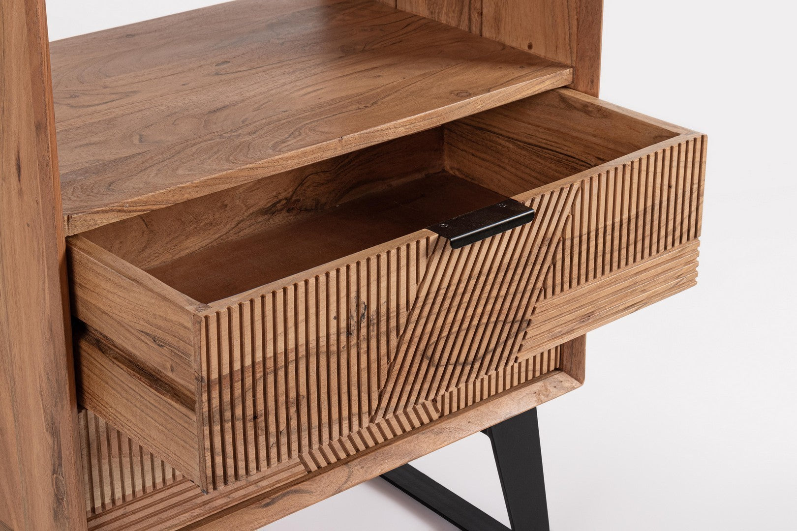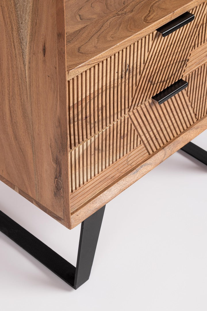 STRUTTURA IN LEGNO DI ACACIA, SCHIENALI E FONDO CASSETTI IN COMPENSATO. FRONTALI CASSETTI INTARSIATI E LAVORATI A MANO. FINITURA ACRILICA PROTETTIVA. MANIGLIE E GAMBE IN ACCIAIO.