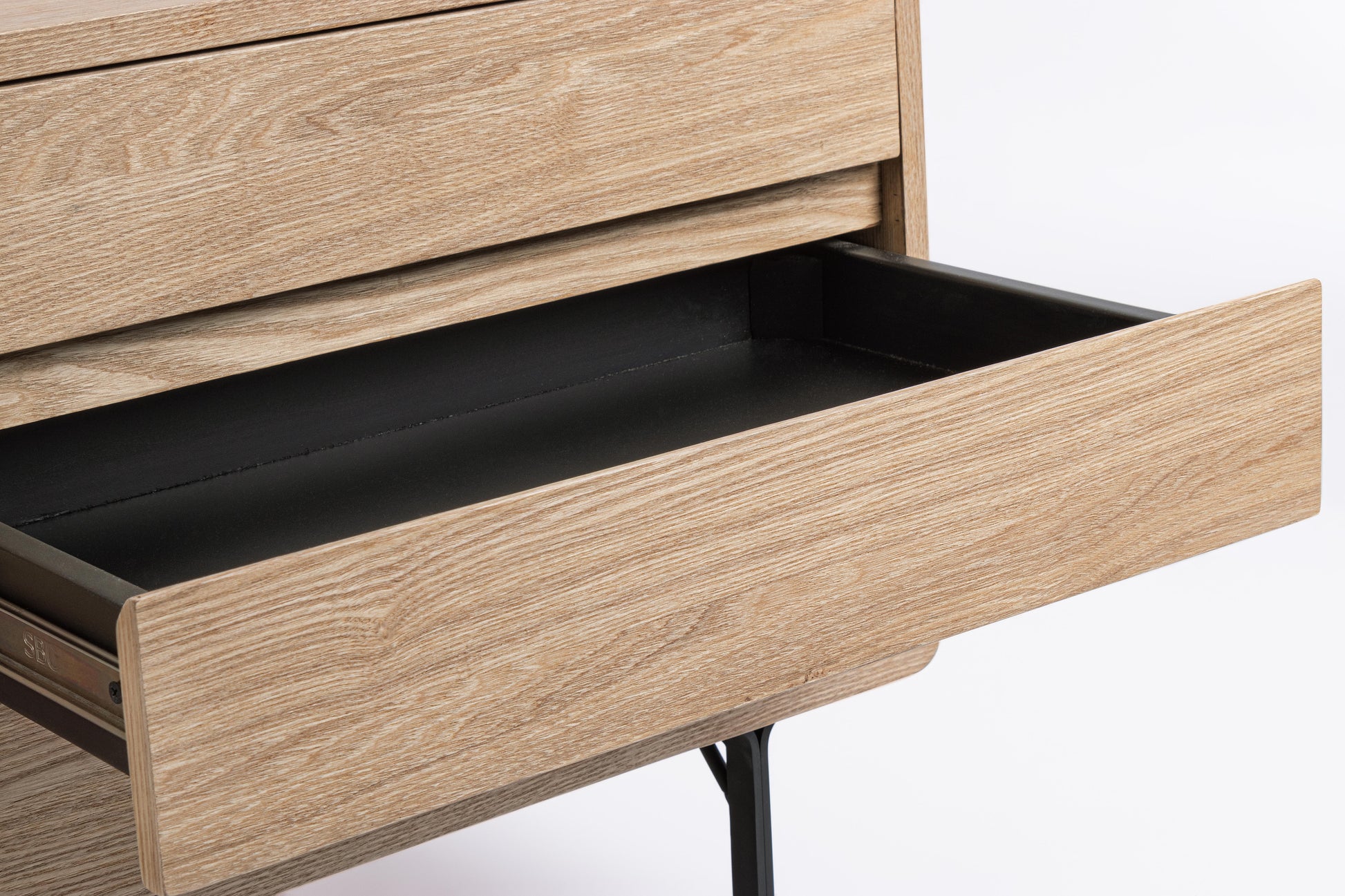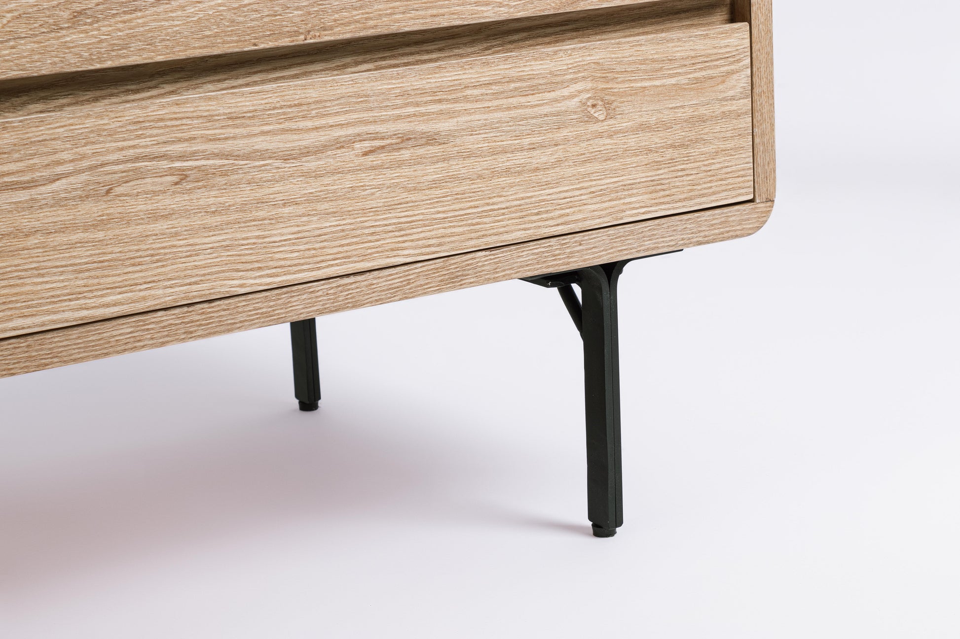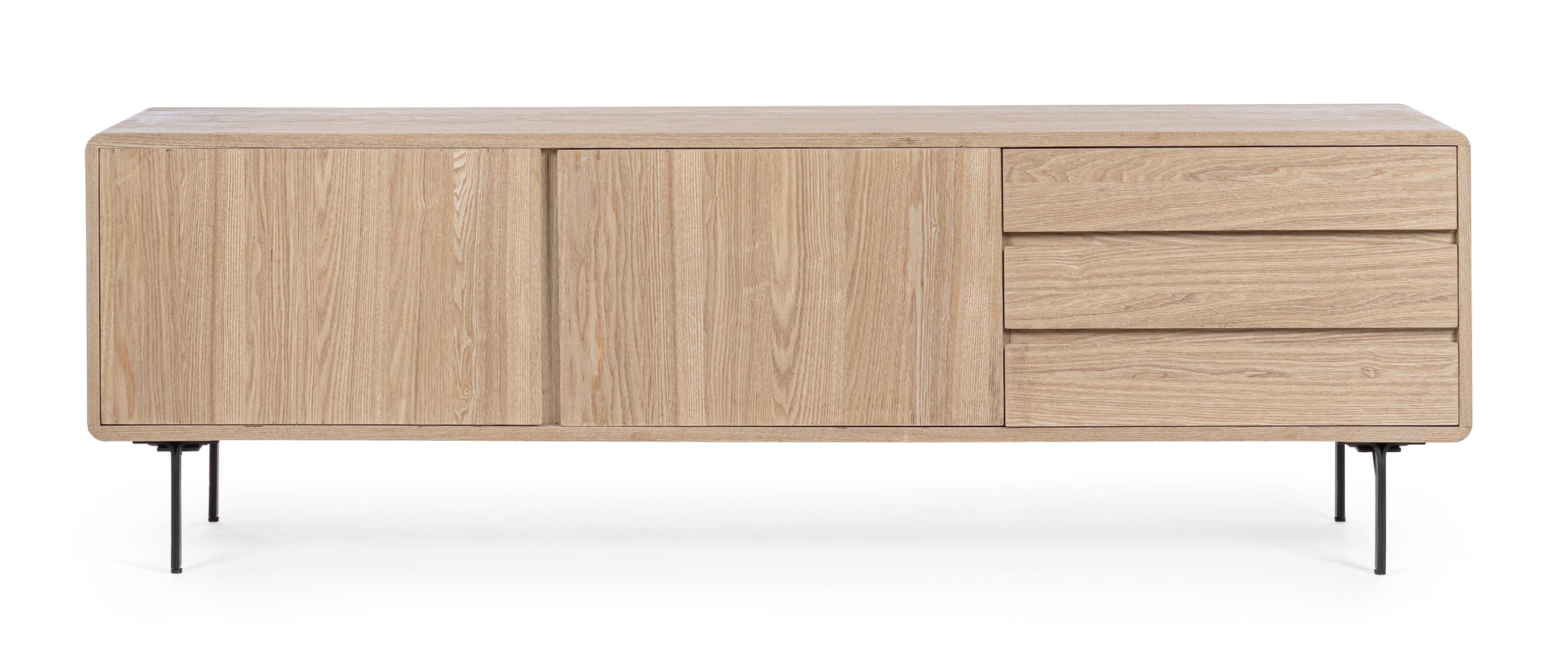 MDF IMPIALLACCIATO LEGNO DI FRASSINO. FINITURA NATURALE CON VERNICE A BASE D'ACQUA. VANO PORTE COMPRENSIVO DI MENSOLA. INTERNO CASSETTI DI COLORE NERO CON GUIDE SCORREVOLI IN ACCIAIO. GAMBE IN ACCIAIO VERNICIATE A POLVERE EPOSSIDICA. GAMBE DA ASSEMBLARE.