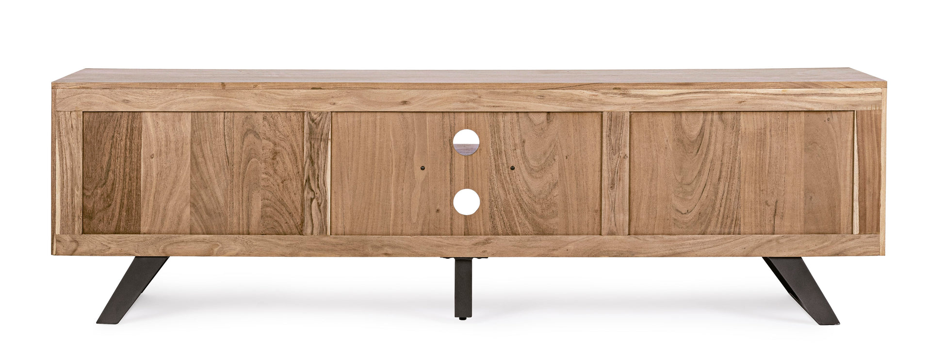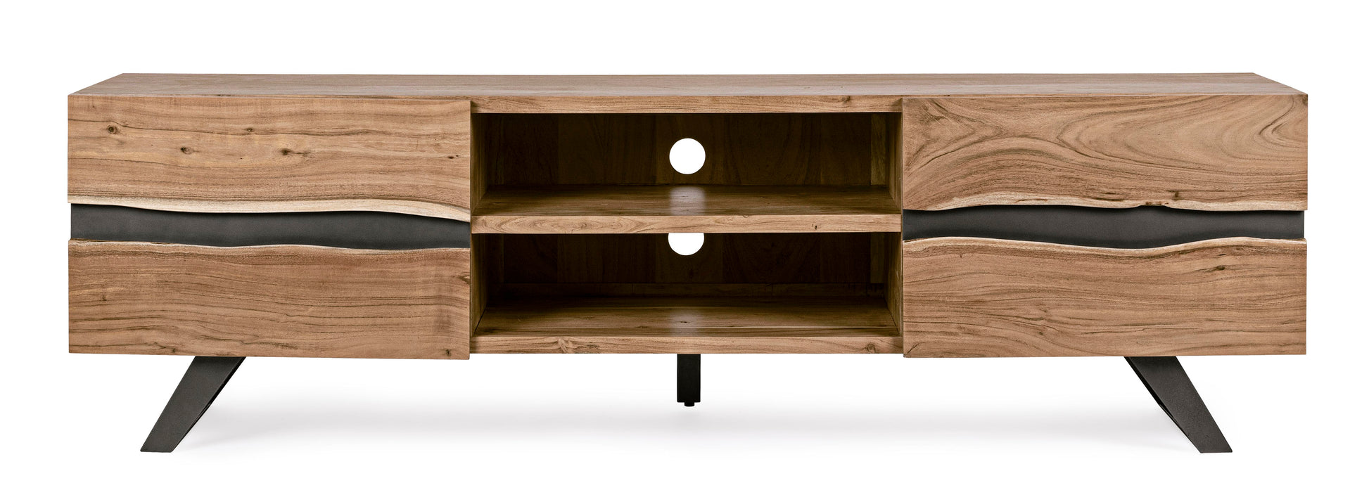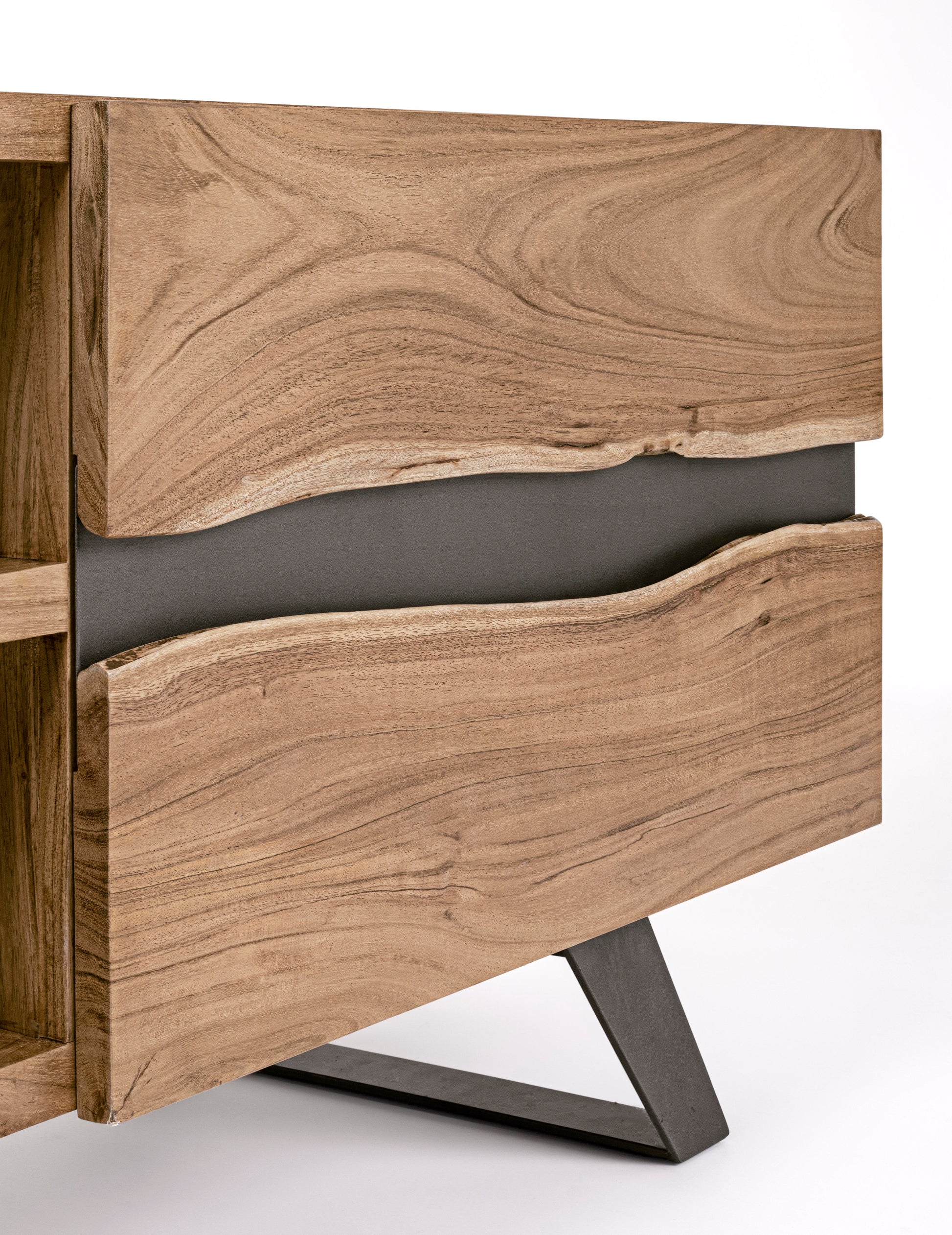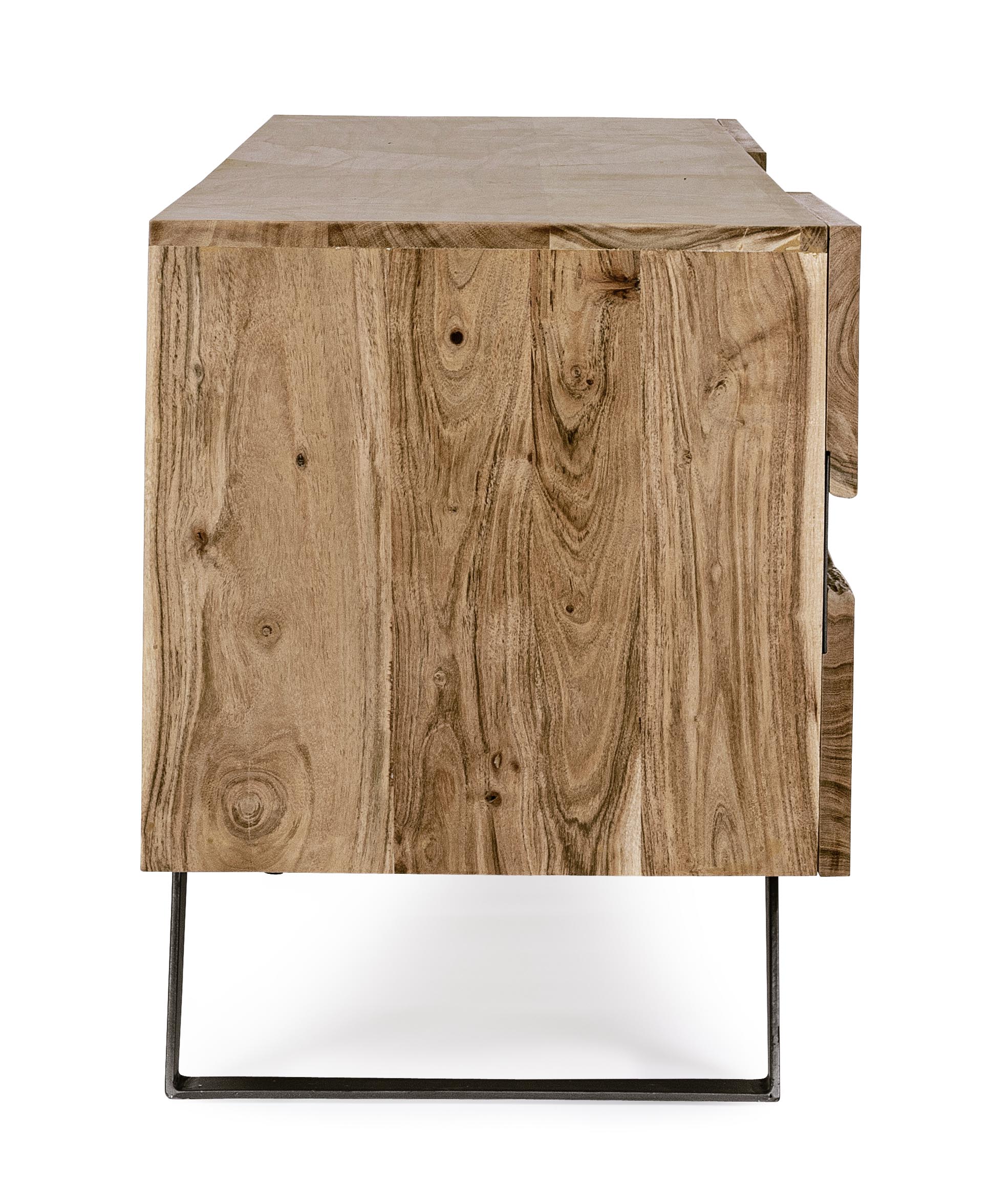 STRUTTURA IN LEGNO DI ACACIA, GAMBE IN ACCIAIO VERNICIATO A POLVERE EPOSSIDICA. PORTE CON INSERTI IN METALLO. FINITURA A BASE DI VERNICE POLIURETANICA.