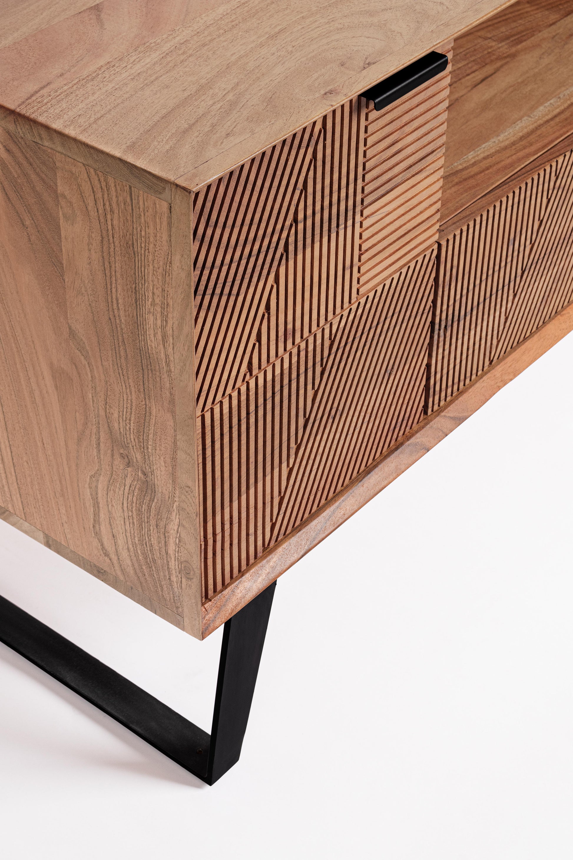 STRUTTURA IN LEGNO DI ACACIA, SCHIENALI E FONDO CASSETTI IN COMPENSATO. FRONTALI ANTE E CASSETTI INTARSIATI E LAVORATI A MANO. FINITURA ACRILICA PROTETTIVA. MANIGLIE E GAMBE IN ACCIAIO. GAMBE DA ASSEMBLARE.