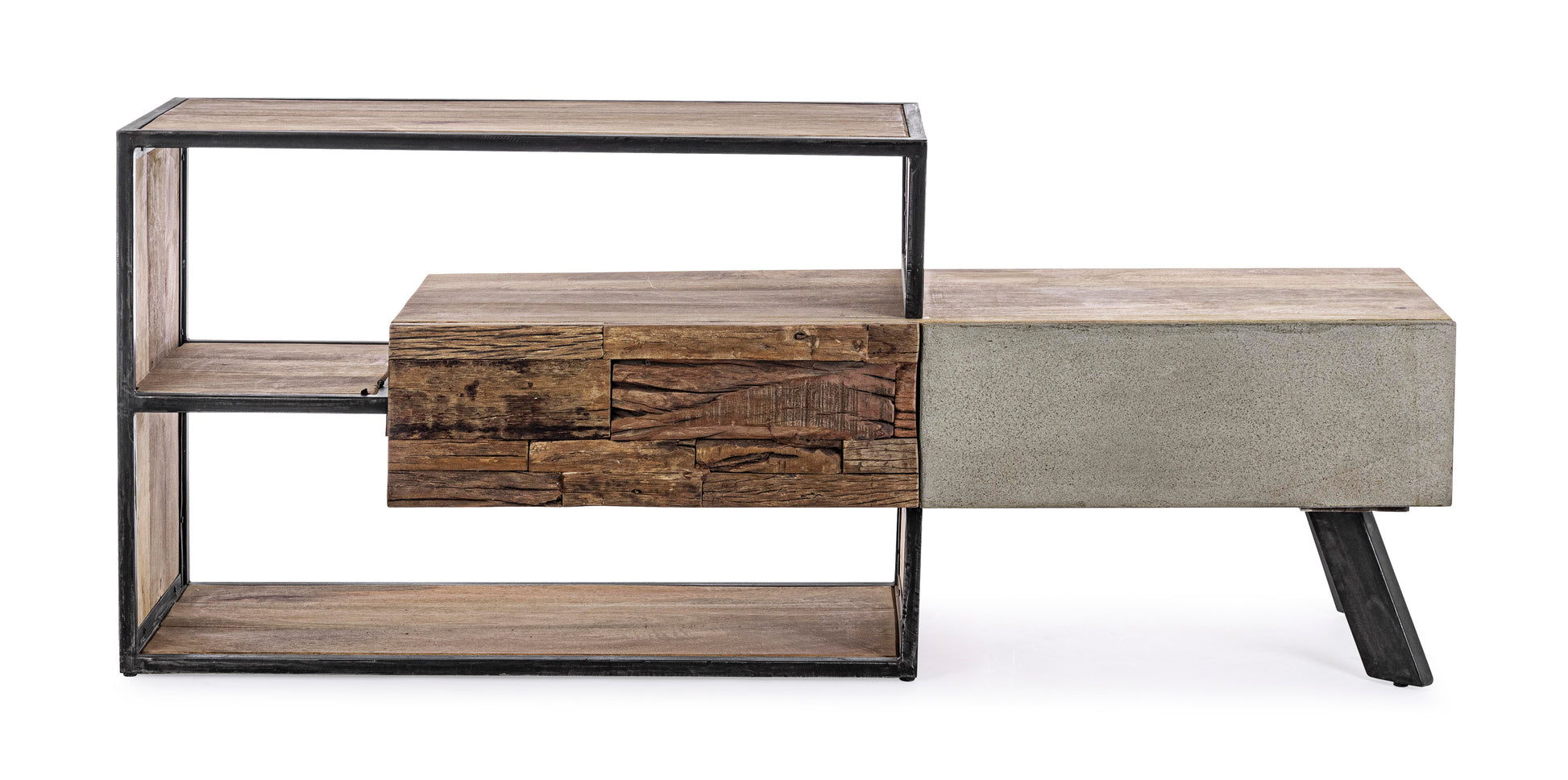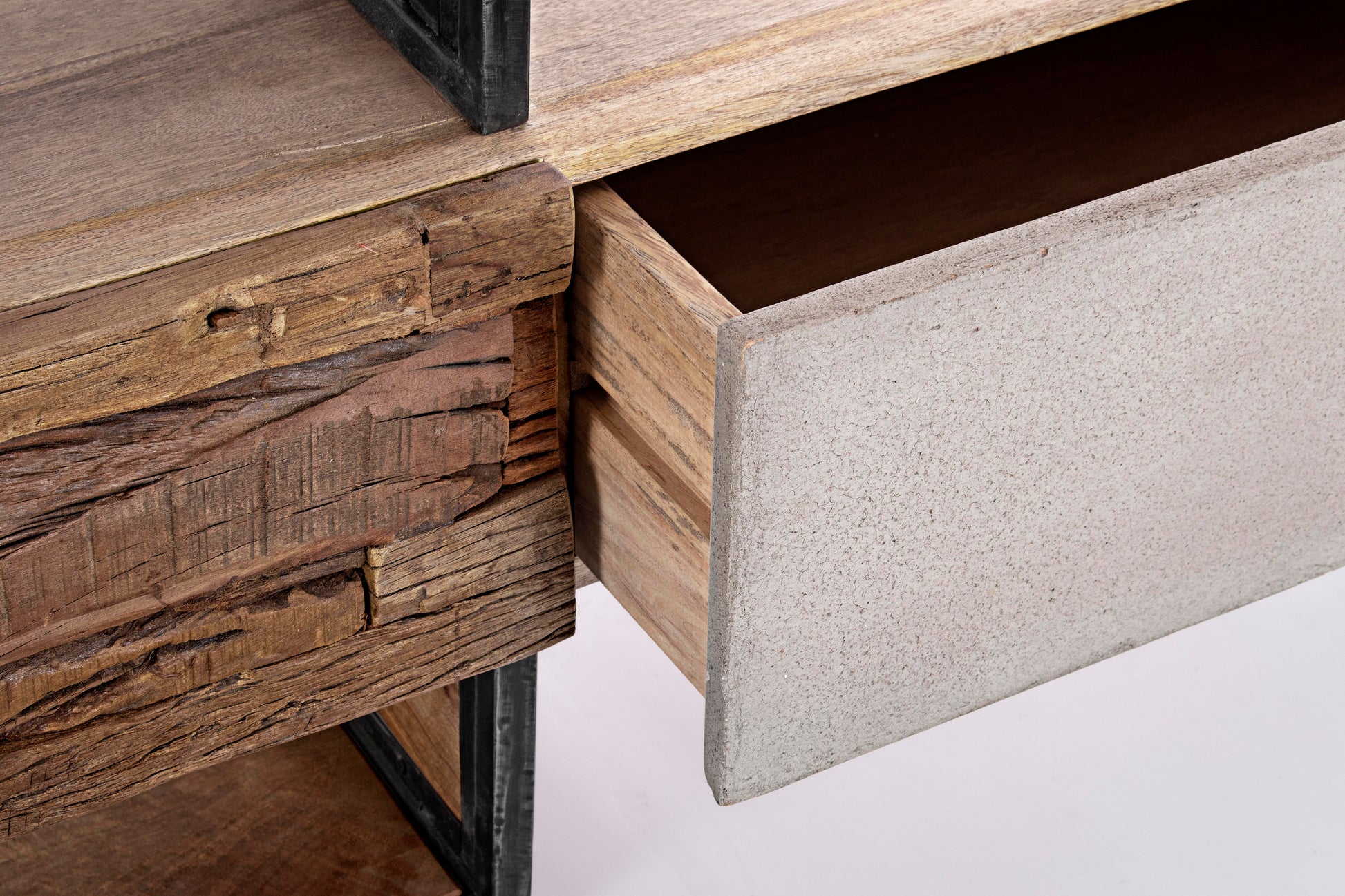 STRUTTURA IN LEGNO MANGO ED ACCIAIO, SCHIENALE IN COMPENSATO. FRONTALE ANTE E CASSETTI IN LEGNO RICICLATO O LAMINA DI ACCIAIO O FINITURA IN FIBRA DI CEMENTO. FINITURA ACRILICA PROTETTIVA. PIEDINI REGOLABILI. IL PRODOTTO IN LEGNO RICICLATO È CARATTERIZZATO DALLA PRESENZA DI TASSELLI IN LEGNO DI DIVERSE SPECIE E COLORE. EVENTUALI FESSURE, CREPE O IMPERFEZIONI, CHE POSSONO GENERARSI ANCHE NEL CORSO DEL TEMPO, SONO CARATTERISTICHE DI QUESTO MATERIALE E RENDONO OGNI PEZZO UNICO E ORIGINALE.