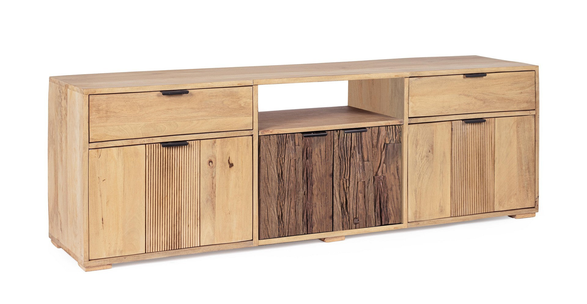 STRUTTURA IN LEGNO MANGO, SCHIENALE IN COMPENSATO. FRONTALE ANTE IN LEGNO DI MANGO O RICICLATO. FINITURA ACRILICA PROTETTIVA. MANIGLIE IN METALLO. IL PRODOTTO IN LEGNO RICICLATO È CARATTERIZZATO DALLA PRESENZA DI TASSELLI IN LEGNO DI DIVERSE SPECIE E COLORE. EVENTUALI FESSURE, CREPE O IMPERFEZIONI, CHE POSSONO GENERARSI ANCHE NEL CORSO DEL TEMPO, SONO CARATTERISTICHE DI QUESTO MATERIALE E RENDONO OGNI PEZZO UNICO E ORIGINALE