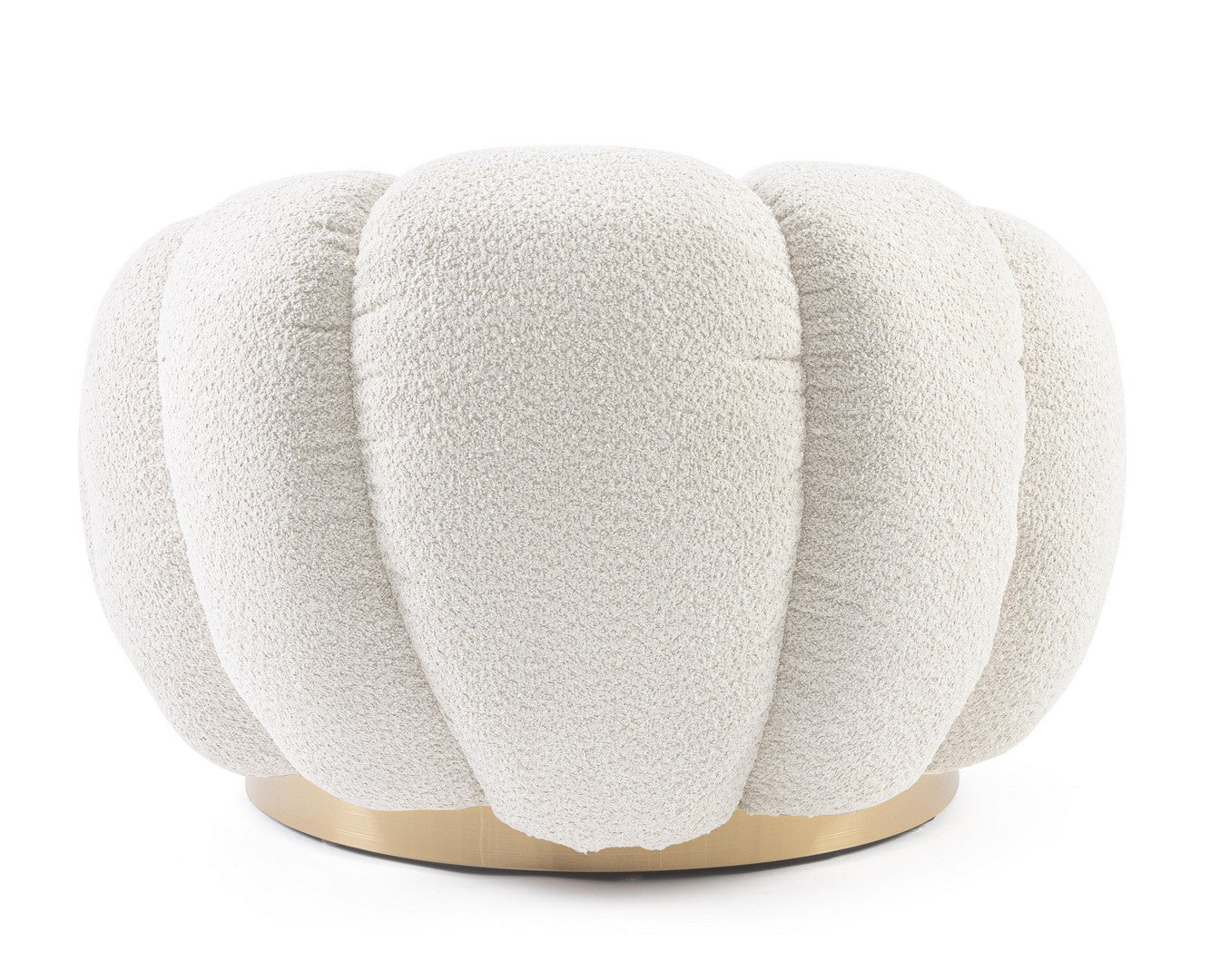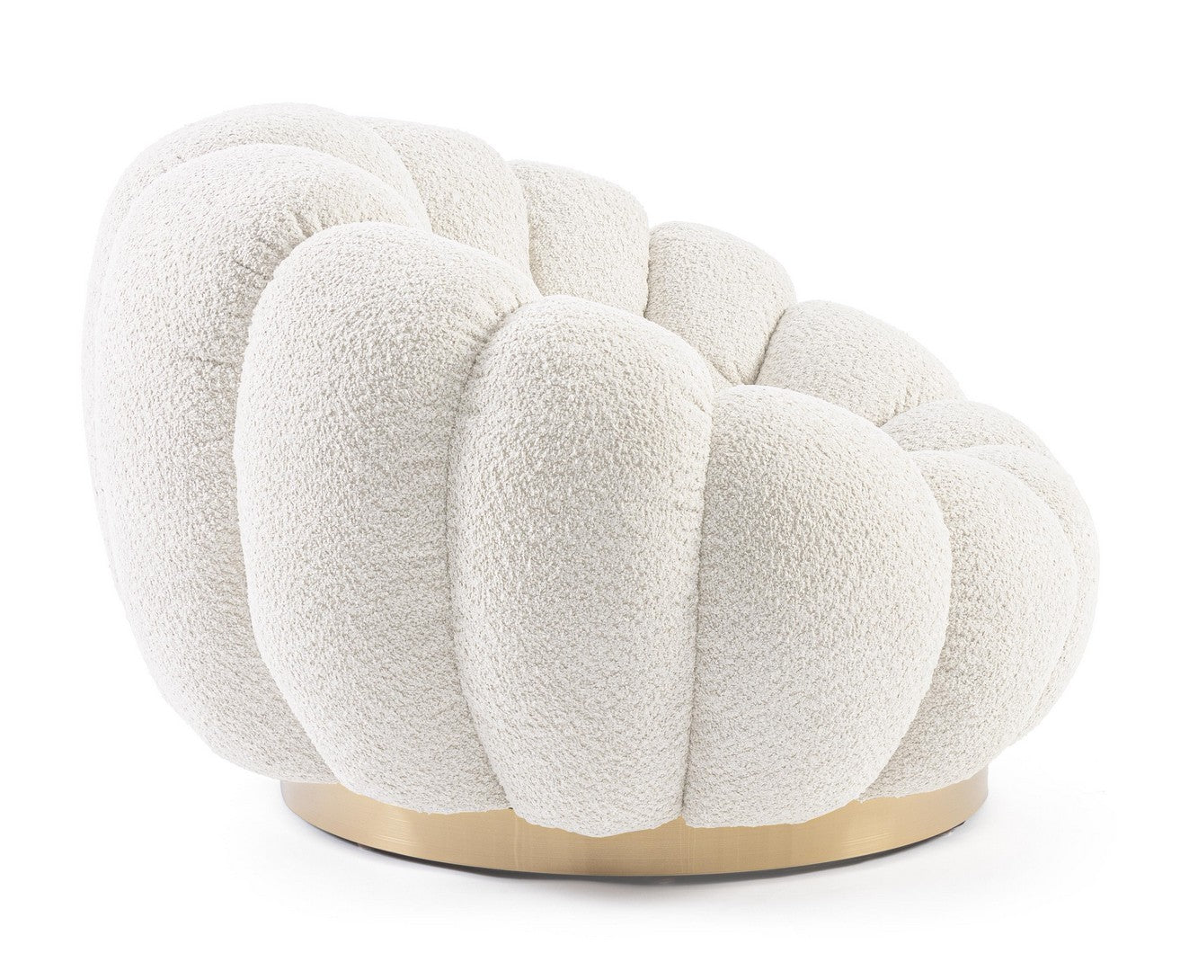 STRUTTURA IN LEGNO. RIVESTIMENTO IN POLIESTERE EFFETTO BOUCLE'. IMBOTTITURA IN SCHIUMA POLIURETANICA (DENSITA' 25KG/M3 SEDUTA, 18KG/M3 SCHIENALE). FONDO CON ANELLO DECORATIVO IN ACCIAIO VERNICIATO COLOR ORO. SEDUTA GIREVOLE A 360°.