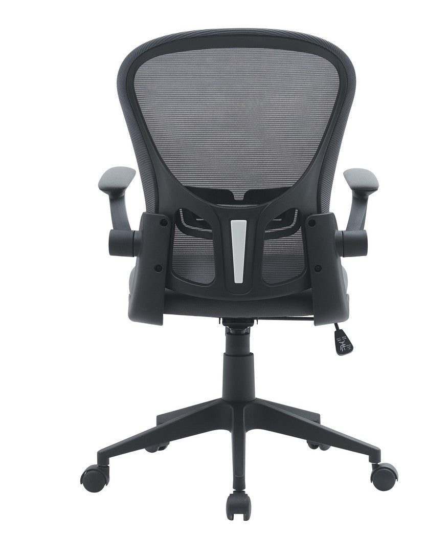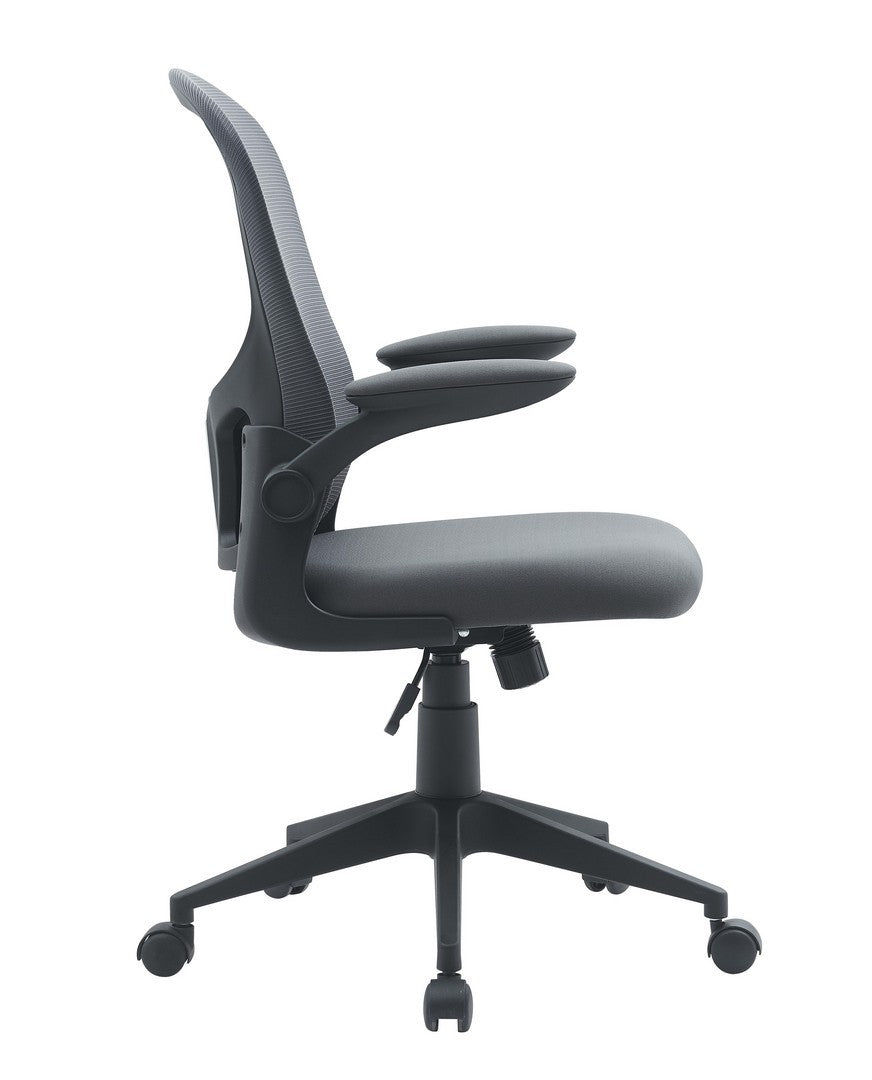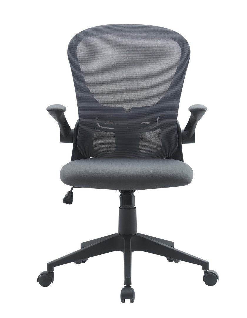 BASE IN NYLON Ø68 CM. RUOTE IN NYLON. SEDUTA IN COMPENSATO, IMBOTTITA IN SCHIUMA POLIURETANICA (DENSITA' 25KG/M3) E RIVESTITA IN TESSUTO POLIESTERE 100%. SCHIENALE IN PLASTICA (PP) RIVESTITO IN TESSUTO A RETE POLIESTERE 100%. BRACCIOLI RIBALTABILI IN PLASTICA (PP) RIVESTITI IN TESSUTO POLIESTERE 100%. REGOLAZIONE DELL'ALTEZZA CON PISTONE A GAS.