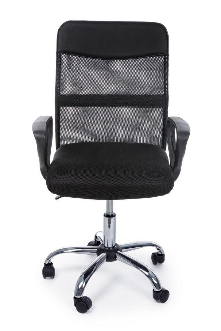 BASE IN ACCIAIO CROMATO Ø53CM. RUOTE IN NYLON. SEDUTA IMBOTTITA E RIVESTITA IN TESSUTO 100% POLIESTERE. SCHIENALE RIVESTITO IN TESSUTO A RETE 100% POLIESTERE CON INSERTO IN SIMILPELLE. BRACCIOLI IN PLASTICA (PP). ALTEZZA REGOLABILE.