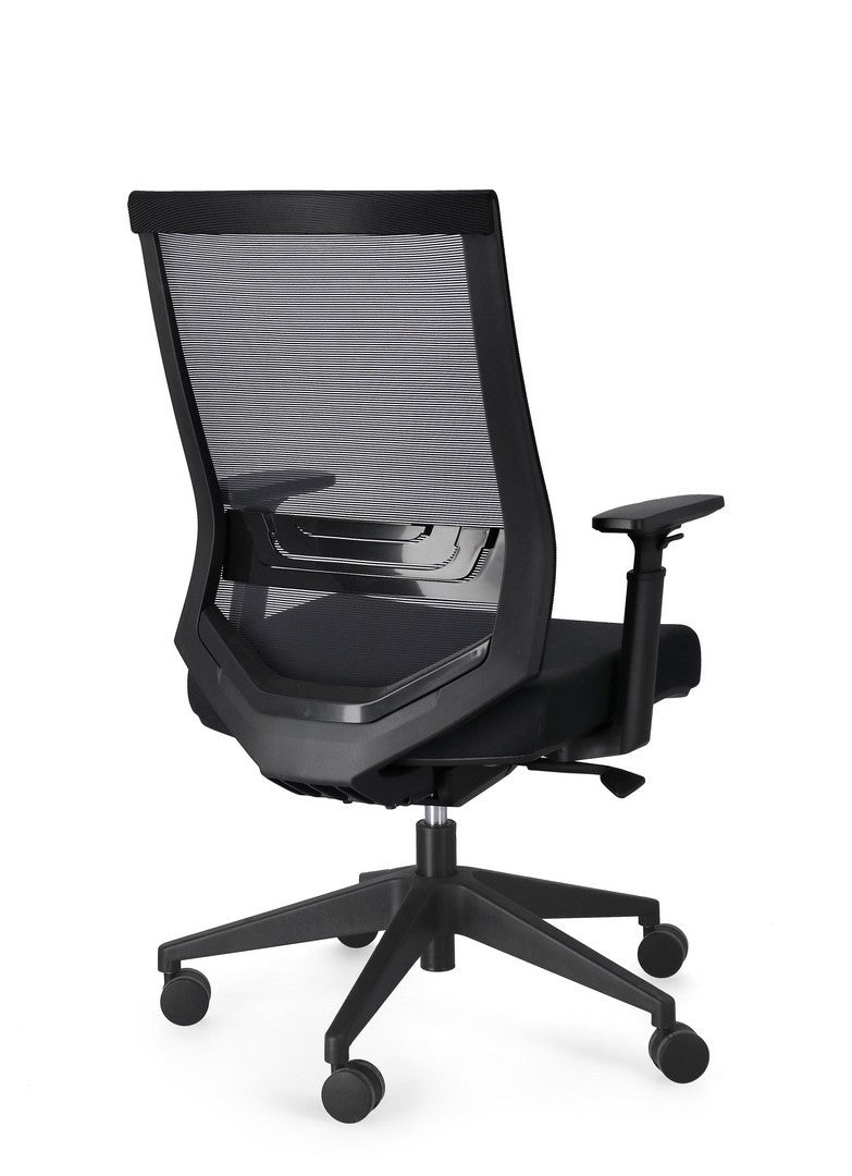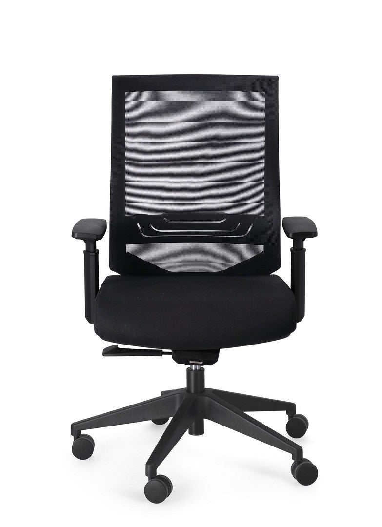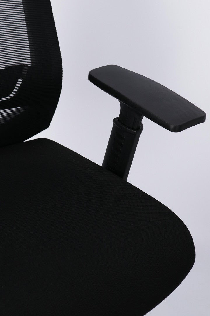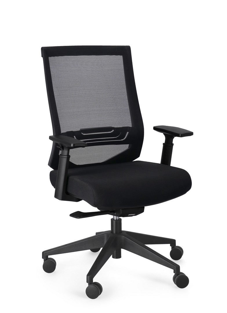 BASE IN NYLON Ø71 CM. RUOTE IN NYLON. SEDUTA CON IMBOTTITURA IN SCHIUMA POLIURETANICA DENSITA' 60KG/M3 E RIVESTIMENTO IN TESSUTO A RETE POLIESTERE 100%. SCHIENALE IN PLASTICA (PP) CON SUPPORTO LOMBARE CON RIVESTIMENTO IN TESSUTO A RETE POLIESTERE 100%. DOTATA DI MECCANISMO SYNCHRO CHE PERMETTE IL MOVIMENTO SINCRONIZZATO TRA SEDILE E SCHIENALE E IL BLOCCO DELLO SCHIENALE NELLA POSIZIONE DESIDERATA (3 POSIZIONI). ALTEZZA SEDUTA E BRACCIOLI REGOLABILE.
