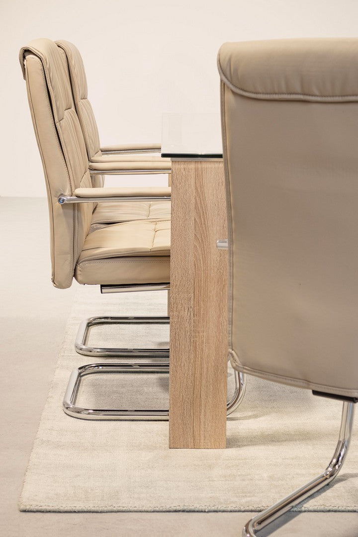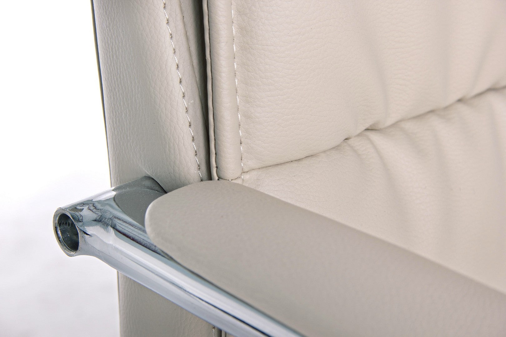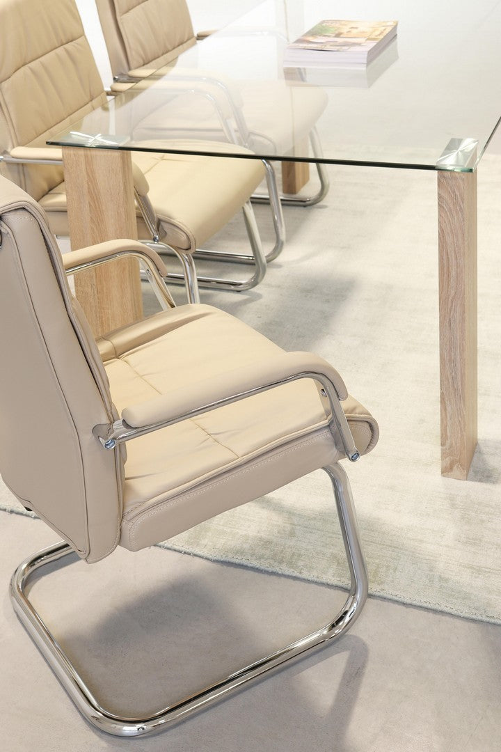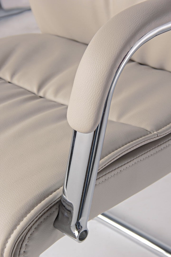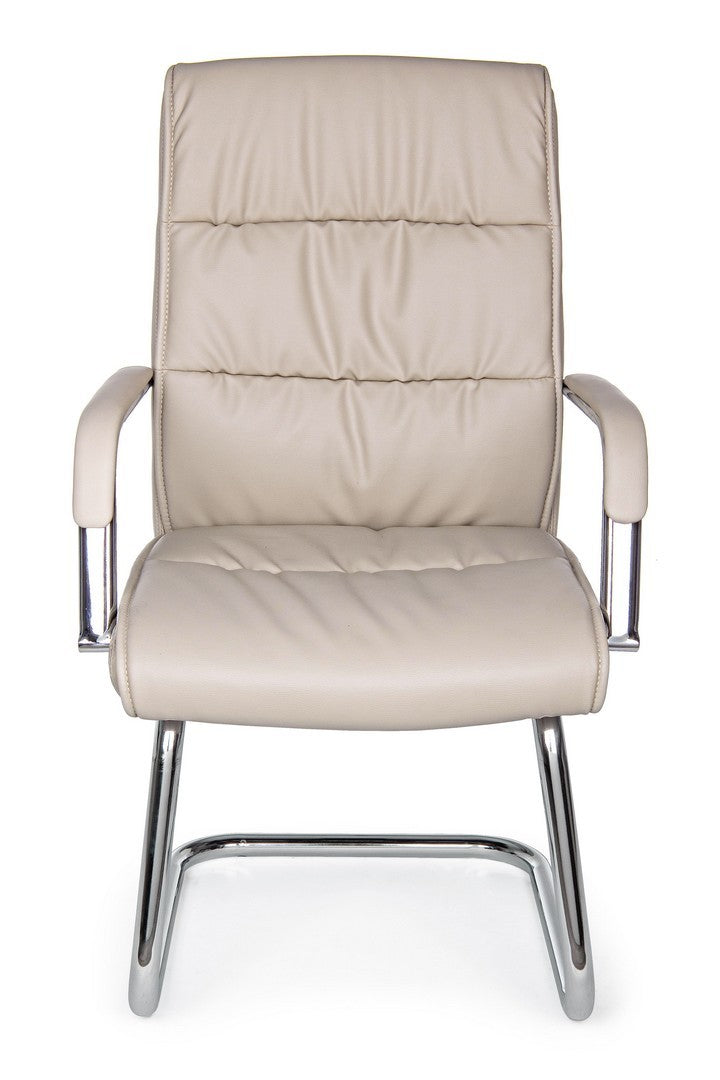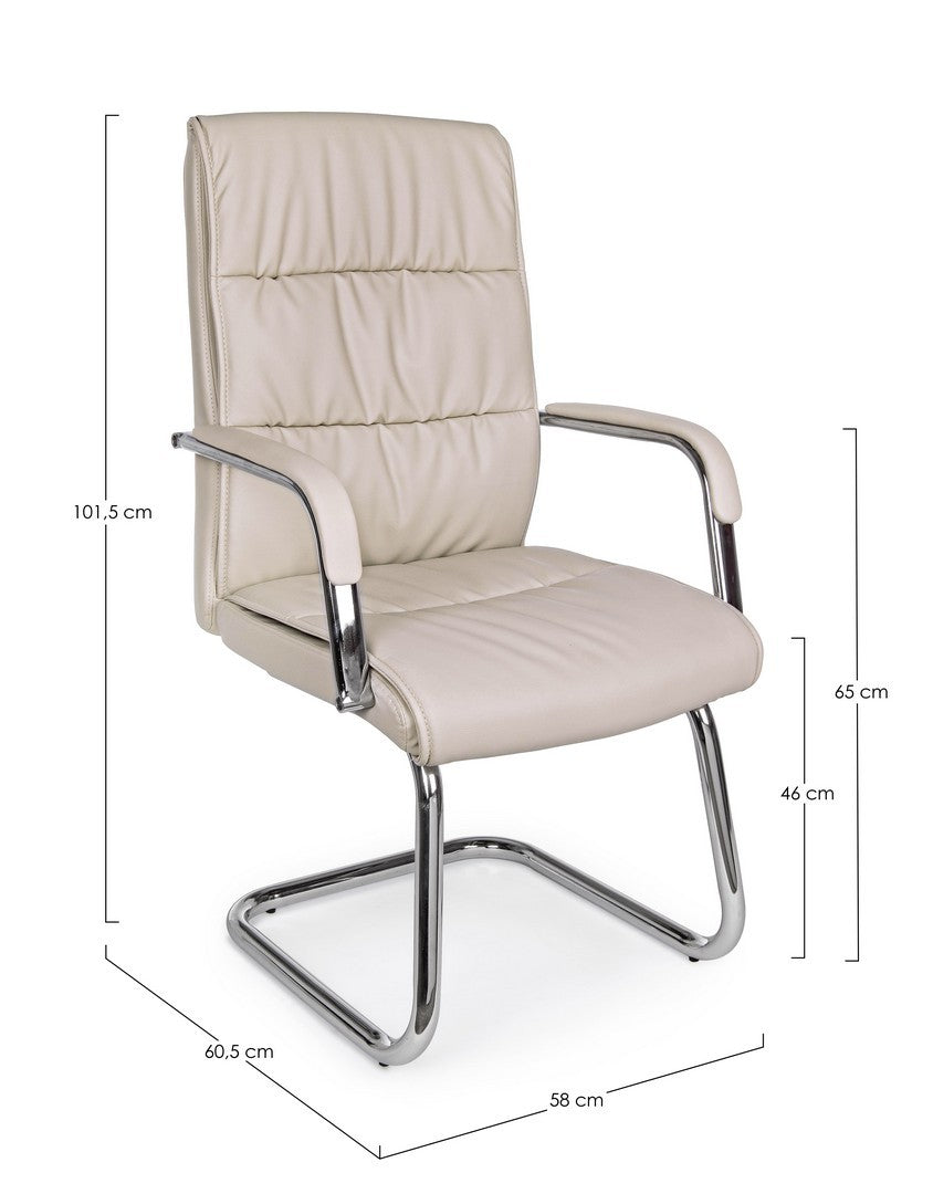 SLITTA IN ACCIAIO CROMATO. SEDUTA E SCHIENALE IMBOTTITI E RIVESTITI IN SIMILPELLE. BRACCIOLI IN ACCIAIO CROMATO CON RIVESTIMENTO IN SIMILPELLE.