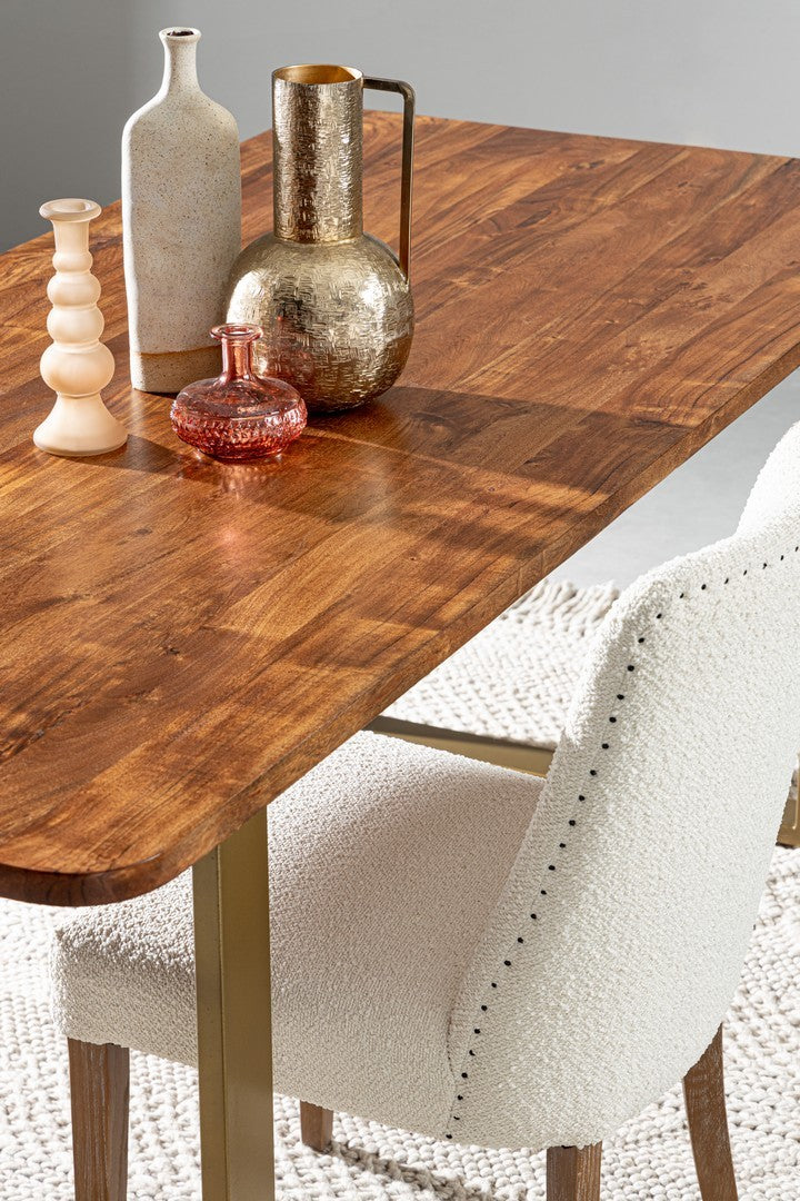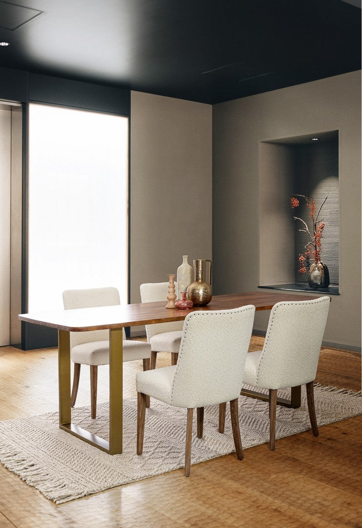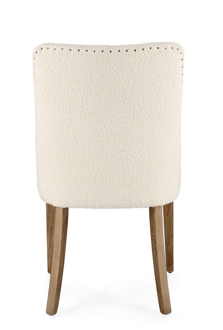 STRUTTURA IN LEGNO DI QUERCIA. RIVESTIMENTO IN POLIESTERE EFFETTO BOUCLE'. SCHIENALE CON APPLICAZIONE DI BORCHIE IN METALLO. DENSITA' IMBOTTITURA IN SCHIUMA POLIURETANICA SEDUTA 30KG/M3, SCHIENALE 25KG/M3.