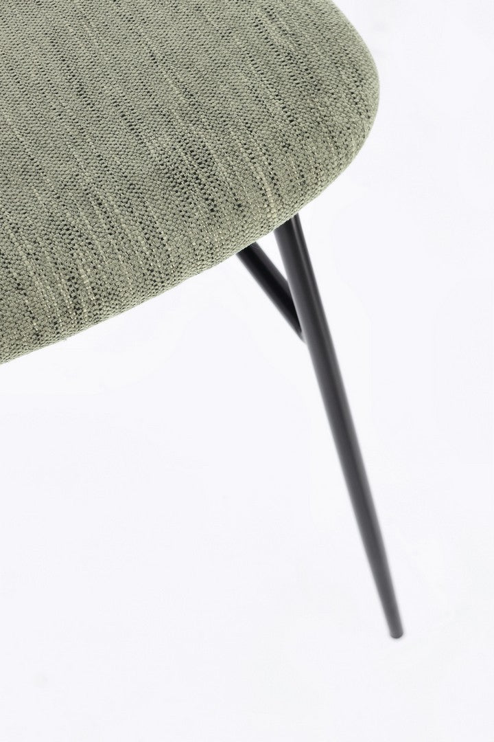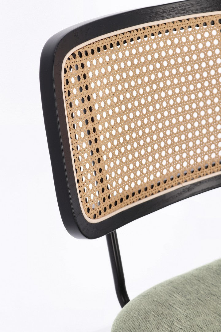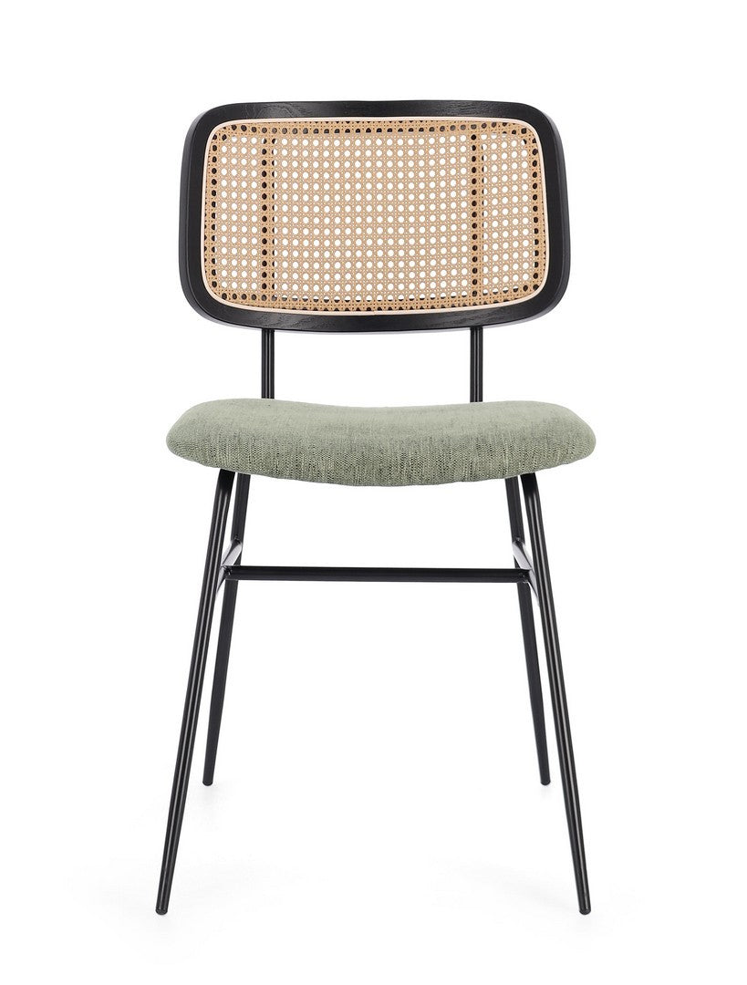 STRUTTURA IN ACCIAIO VERNICIATA A POLVERE EPOSSIDICA. SEDUTA IN COMPENSATO CON RIVESTIMENTO IN 100% POLIESTERE. SCHIENALE IN COMPENSATO CON LAVORAZIONE IN FIBRA SINTETICA EFFETTO RATTAN.