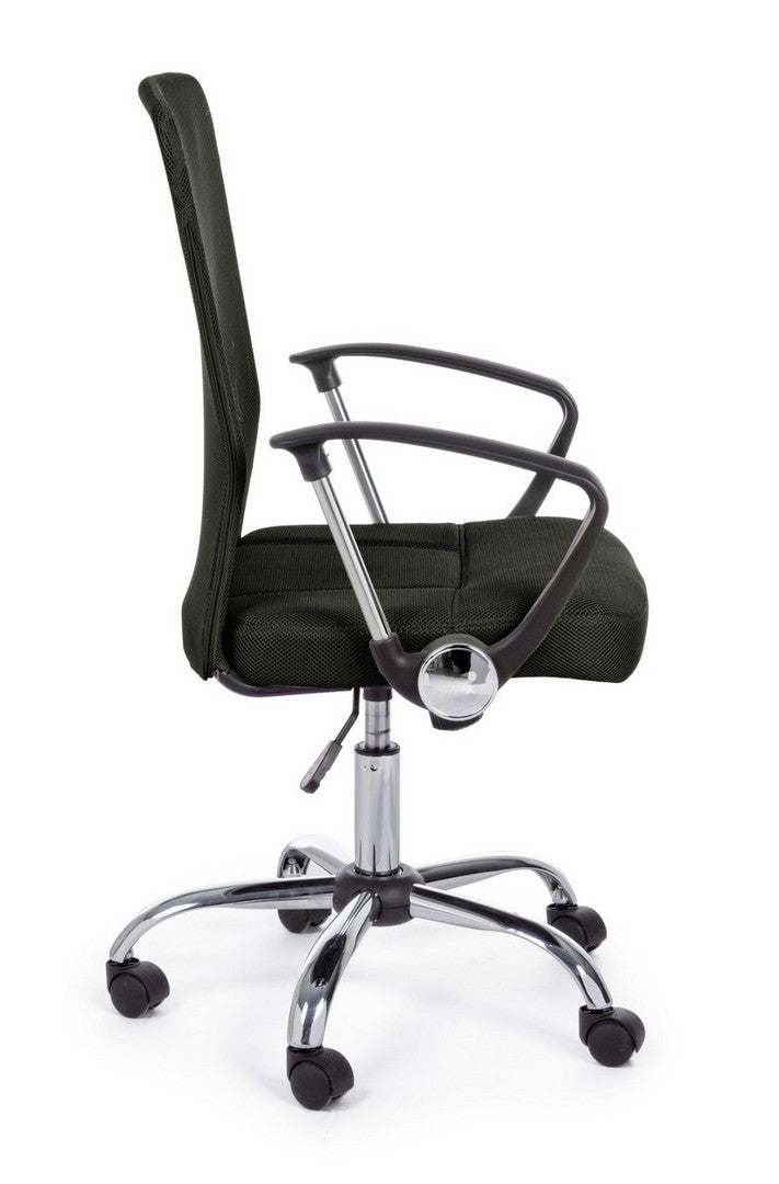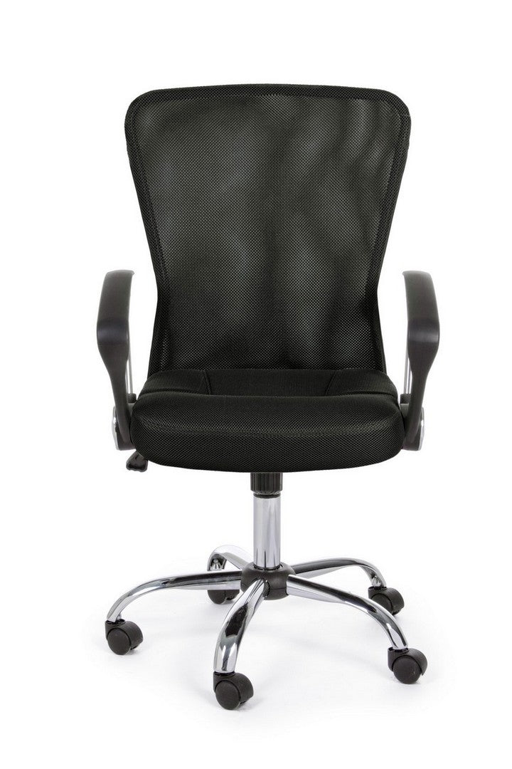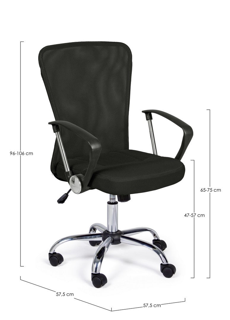BASE IN ACCIAIO CROMATO Ø56 CM. RUOTE IN NYLON. SEDUTA IMBOTTITA E RIVESTITA IN TESSUTO A RETE POLIESTERE 100%. SCHIENALE RIVESTITO IN TESSUTO A RETE POLIESTERE 100%. BRACCIOLI IN PLASTICA (PP). ALTEZZA REGOLABILE.