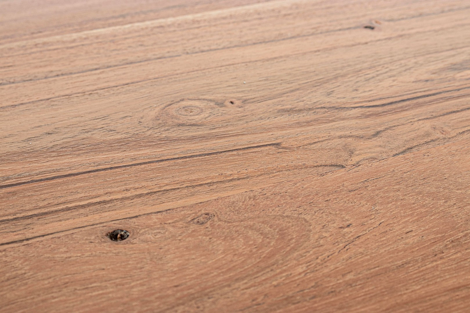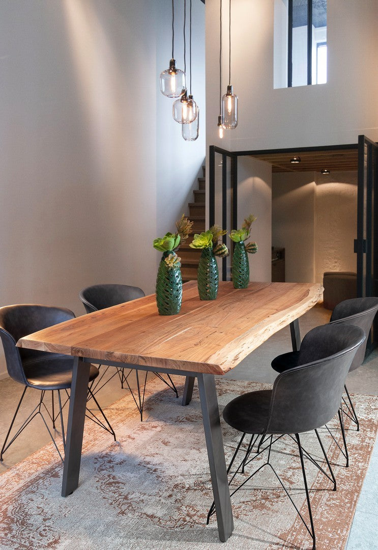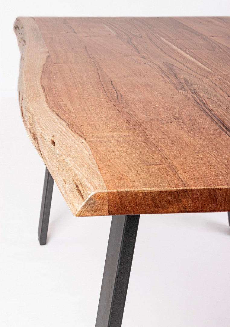 GAMBE IN ACCIAIO VERNICIATO A POLVERE EPOSSIDICA. PIANO IN LEGNO DI ACACIA CON BORDI IRREGOLARI (EFFETTO LEGNO VIVO). FINITURA A BASE DI VERNICE POLIURETANICA. ESSENDO UN PIANO LAVORATO A MANO, LE FORME E LE MISURE DEL LEGNO SONO SOLO INDICATIVE. TUTTI I PRODOTTI SARANNO DIVERSI L'UNO DALL'ALTRO.